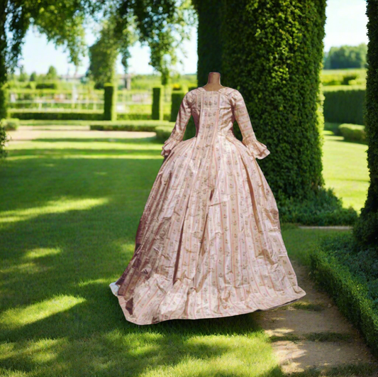 The Italian Gown, also known as the open dress, was a popular style from the mid-1770s to the early 1790s. Defined by a separate-cut bodice and skirt, it offered a more tailored, versatile alternative to earlier gowns cut in one back piece. Worn over a visible petticoat, the open front created elegant layering, while the fitted back panels reflected the shift toward cleaner, more natural silhouettes in late 18th-century fashion. Made in silk, printed cotton, or fine linen, Italian gowns balanced structure, movement and decorative detail for both daytime and formal wear.