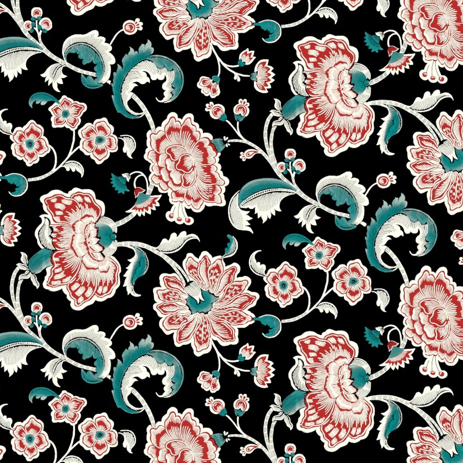This striking floral design is inspired by an 18th-century Swedish printed pattern, characterised by large-scale blossoms, curling leaves, and elegant trailing stems. Set against a deep black ground, the warm red florals and cool blue accents create a dramatic yet refined contrast typical of high-quality European cotton prints from the mid-1700s.