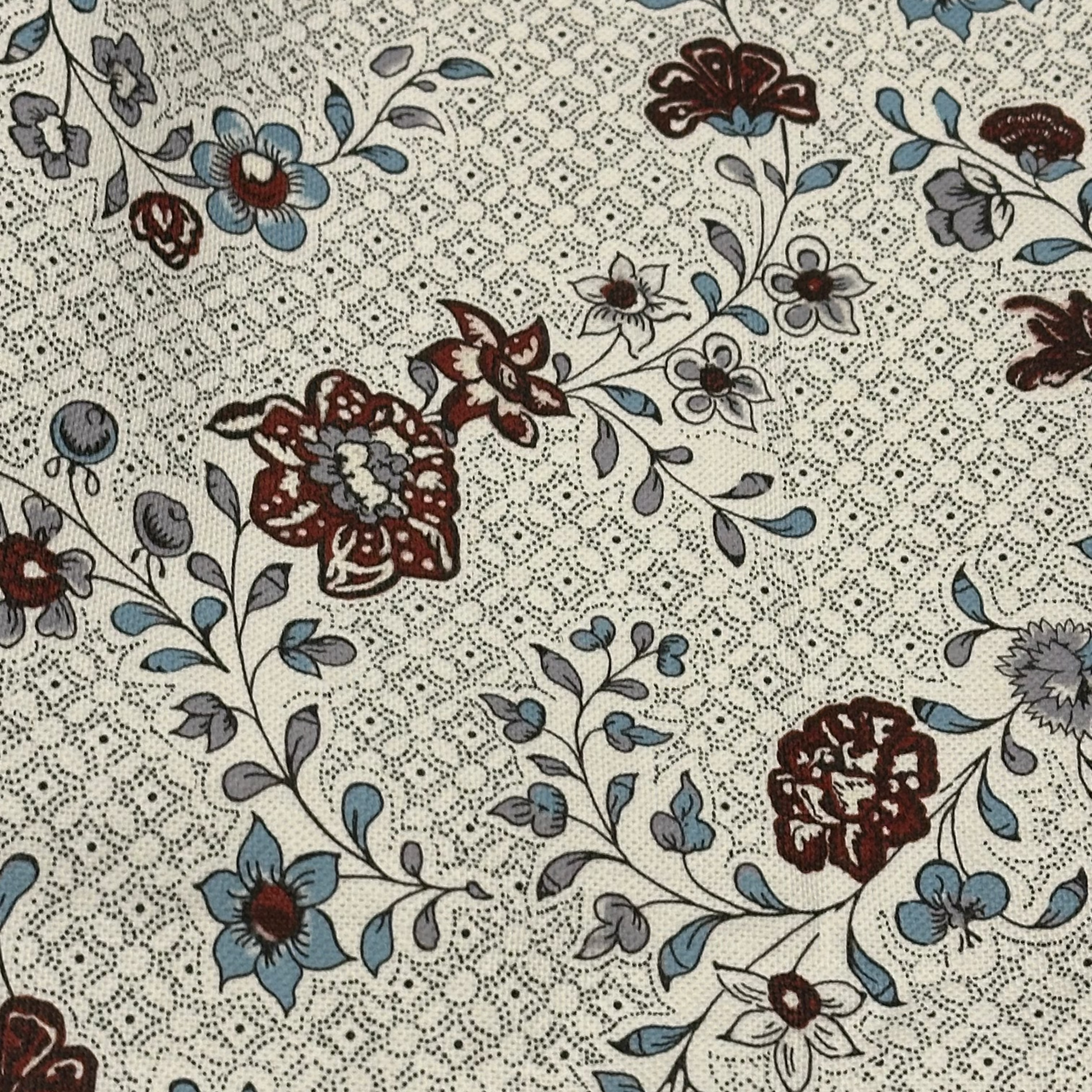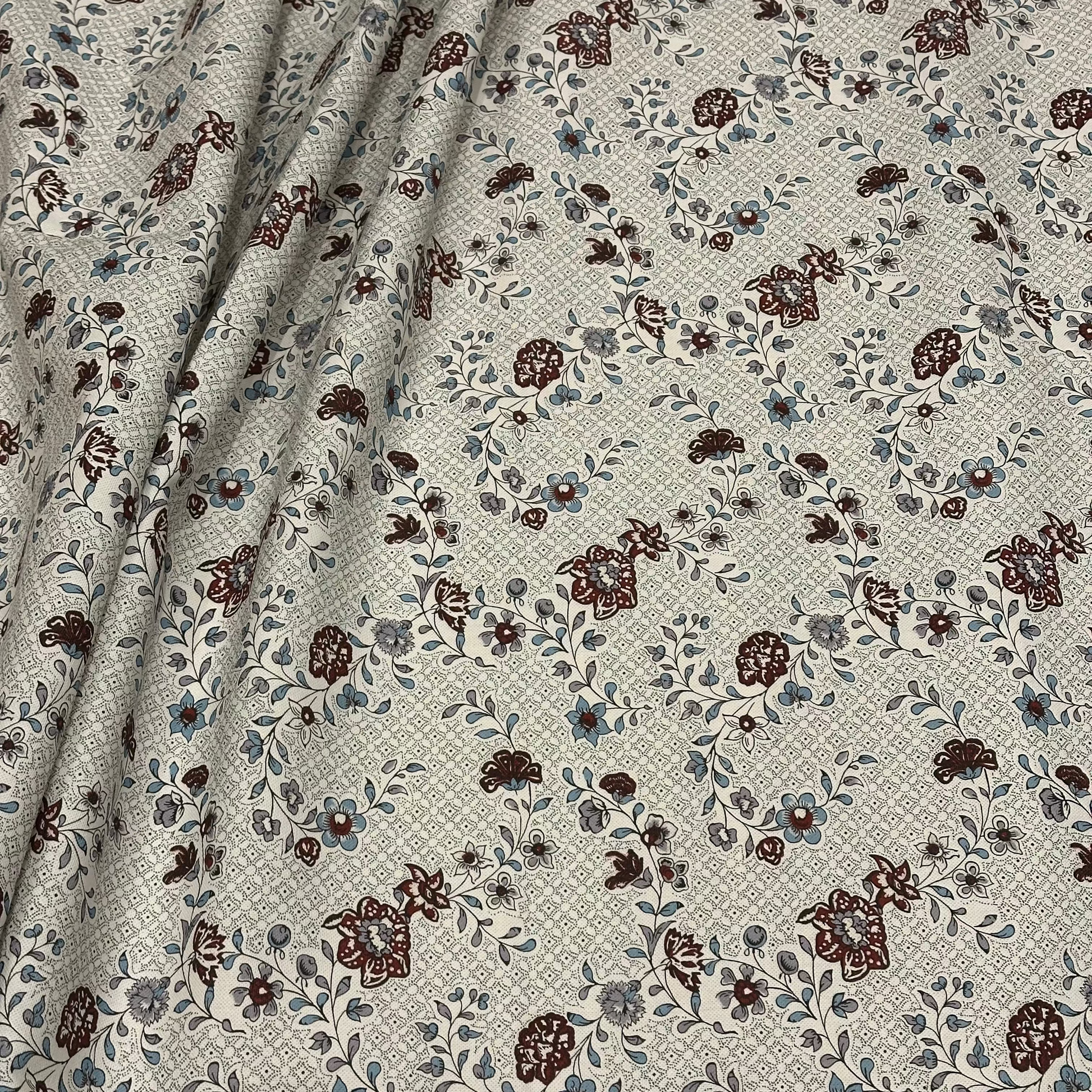 This design is inspired by an 18th-century Oberkampf (Jouy) fabric — a graceful scrolling floral printed on a delicately stippled ground with refined “pinceautée” hand-painted details. The colors have been softened to achieve a natural luster, reminiscent of aged cotton rather than modern white.