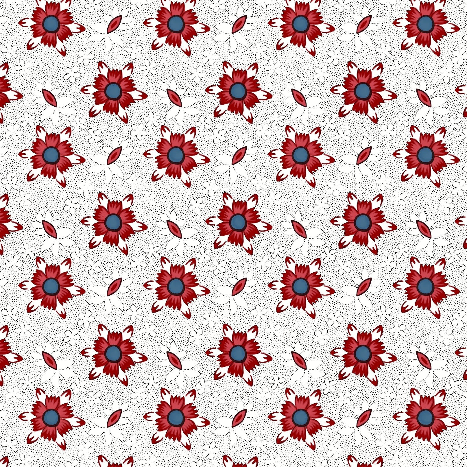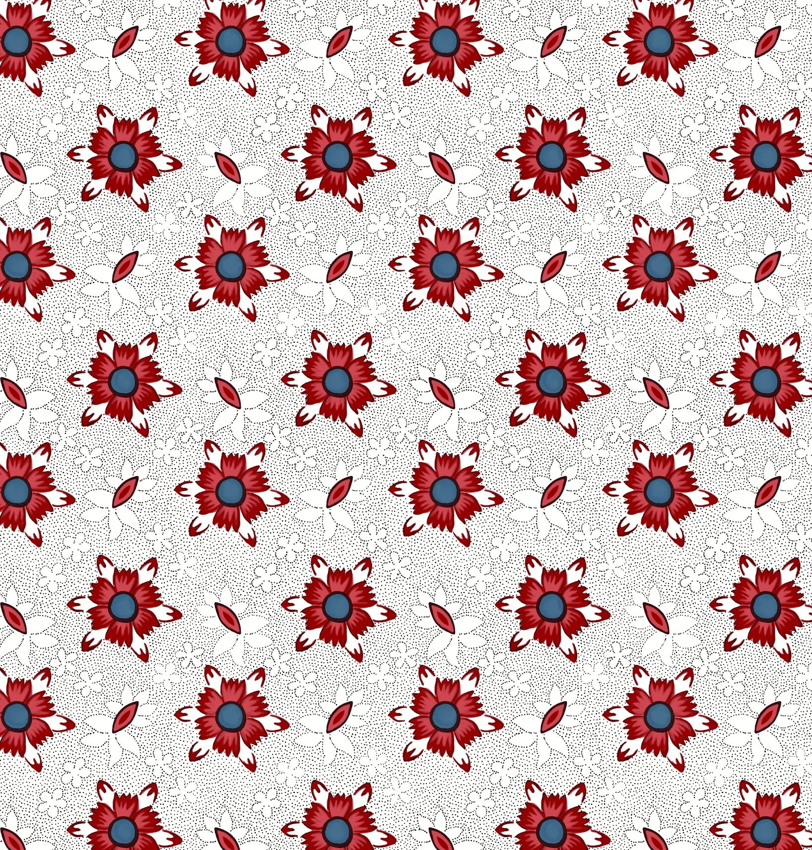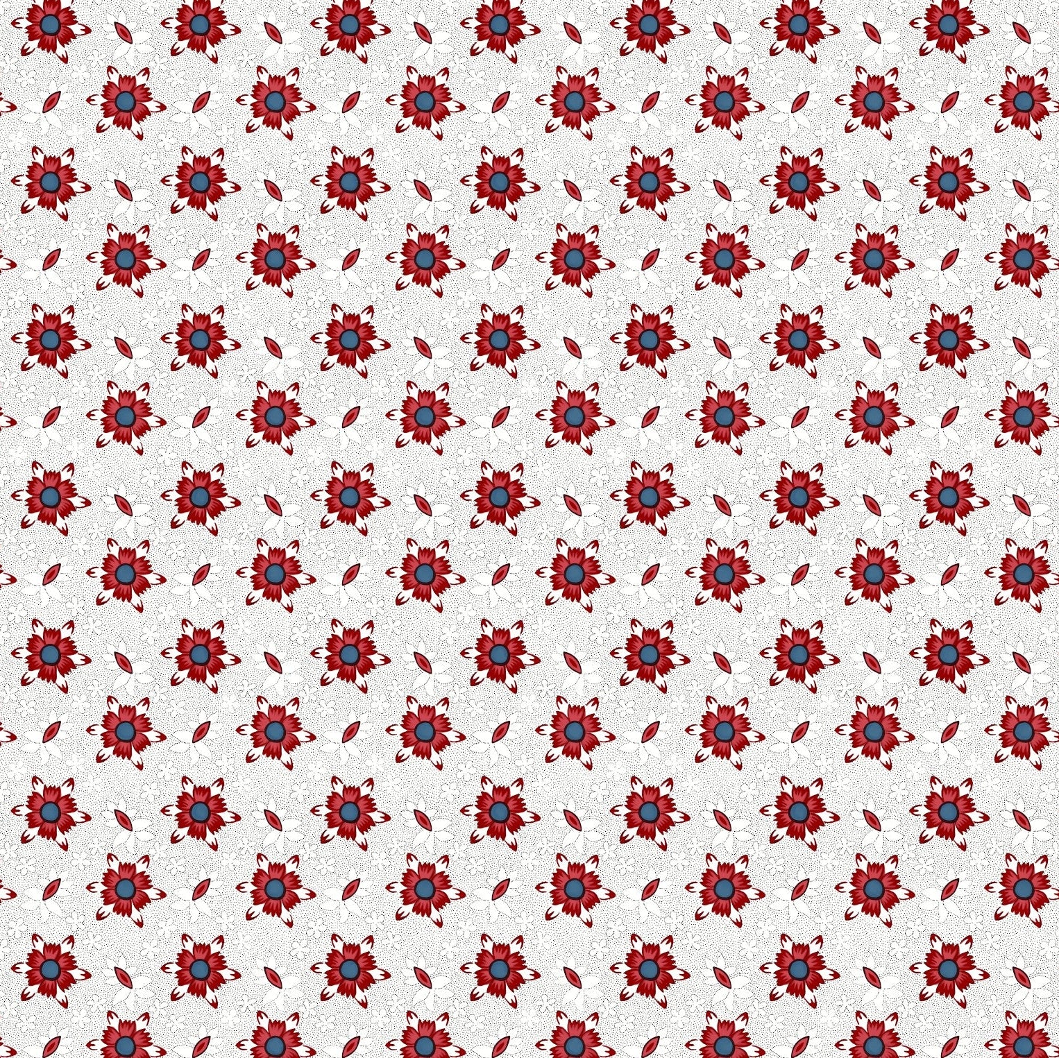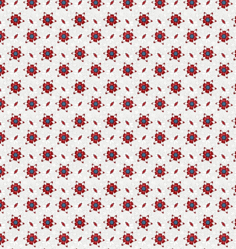 This bold floral pattern is inspired by late 18th-century cottons used in everyday gowns of the 1790s. Featuring stylized red flowers with dark blue centers on a delicately dotted white ground, the design reflects the period’s shift toward stronger contrasts and simplified motifs. Perfect for recreating historical garments or adding a touch of Georgian charm to modern projects, this print captures the confident elegance of the late 18th century.